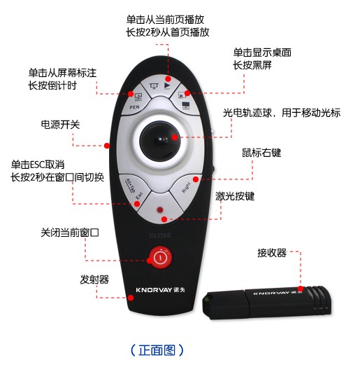 特色功能光教鞭 第三代光电鼠标 一键全屏放大 多个演示专用功能键 2节7号电池 1.基本描述 Novia诺为无线多功能演示器是一个全方位的电脑遥控器,它具有并超越无线鼠标的全部功能,能方便、准确、灵活的遥控电脑。特别适合于在演讲、培训、教学、会议、数字化家庭等场合用作电脑遥控器。它所具有的多项创新技术,能无限您的无线数字生活! Novia诺为无线多功能演示器是诺为公司精心设计的2.4G全向无线光电多功能演示器,本产品充分体现了人性化之设计理念。无论是商业用户,还是家庭用户,本产品将带给您前所未有的轻松与喜悦的使用乐趣,诸多全新的专利技术将使您体验到前所未有的操作感受。 2.主要功能及特点 A) 集成激光指示器 Novia诺为无线多功能演示器集成激光指示器,具有激光笔、激光教鞭的功能。指示重点,一目了然! 它采用满足国际安全标准Class II的激光器,能有效节省电池电力并能够避免激光对眼睛的物理损伤。(Class II激光短时照射到眼睛时,会造成眼睛局部暂时失明,但不会超成永久性伤害。长时间照射仍然会对眼睛超成永久性损伤,因此严禁将激光照射到人的眼睛,更多信息请参阅激光器国际安全Class II标准)。 B) 集成PowerPoint演示器 Novia诺为无线多功能演示器集成PowerPoint演示器,能够遥控上下翻页、一键使PowerPoint进入全屏演示状态、一键黑屏。在运行随机附带的绿色软件ZoomIt后,还可提供休息时间倒计时功能。只需按一下快捷键,即可在屏幕上提供休息时间倒计时。其中T4还可以实现一键全屏自由标注功能,T5可以实现一键进入Windows Media Center媒体中心的功能。让你摆脱电脑束缚,演讲、培训、教学更加潇洒自如。 C) 集成第三代高灵敏度无线太空光电鼠标 Novia诺为无线多功能演示器集成第三代高灵敏度无线太空光电鼠标,具有无线鼠标的全部功能。 其高达1000CPI的光学解析度,让光标定位更加准确、灵活。 它采用光电技术,没有机械器件,不会出现机械鼠标长期使用时,灰尘降低机械器件灵敏度的情况。长期使用,也不需要拆开清洗。 D) 一键全屏自由缩放功能 Novia诺为无线多功能演示器集成一键全屏自由缩放功能。在运行随机附带的绿色软件ZoomIt后,只需轻按放大按钮,即可自由放大屏幕任何一个地方,让听众不错过每一个细节。即使坐在后排的观众,也能借此功能,看清演示内容。 E) 媒体播放功能 Novia诺为无线多功能演示器中的T3和T5更独具有针对Media Center / Media Player的遥控功能,拥有音量控制、上一曲目、下一曲目、播放及暂停等功能键,让您的媒体播放更轻松、更快捷。 F)采用2.4G RF技术,无方向性,干扰小无线部分采用2.4G国际绿色RF技术,没有方向性,发射器和接收器之间不需要对准。只要接收器没有被金属物体屏蔽,在任何方向都可以控制电脑。采用红外技术的遥控器,如普通电视遥控器,在进行控制时,需要把发射器对准接收器。无线部分采用2.4G国际绿色频率,并使用冲突检测技术,自动更改频道,可以最大限度减少其它无线设备的干扰。 G) 其它卓越特性 15米范围全方位随意无线控制,250平方米会议室、教室、套房内均可自由走动,遥控时不需要对准电脑。 根据人体工学设计,操作灵活方便,流线造型,手感舒适,左、右手均可操作。 采用自动待机、电源开关双重节能设计,最大限度延长电池使用时间。 采用2节普通AAA(普通7号)电池,便利店均有销售,容易更换。 采用USB2.0技术,即插即用,无需安装驱动软件。 提供多个快捷功能键,使用方便。 3参数 介绍 : T8产品由发射器和接收器两部分组成。集成第三代太空光电鼠标模块,具有鼠标的全部功能。人体工学外形,多重快捷键,工艺精良。附带随机绿色软件,具有一键全屏自由缩放、全屏自由标注、休息时间提醒三大功能。 功能: II类激光教鞭 第三代高灵敏度光电鼠标 一键全屏自由播放七个快捷键 双重节能(开关机、自动待机) 参数:遥控方式 RF无线射频技术 / 7号电池 2 / 发射频率 2.4 G / 控制距离 15M / 工作电压 2.4~3.5V 4.5~5.5V / 尺寸 123*30*14mm 73*26*14mm / 重量 55g 11g / 4.适用操作系统 适用所有Windows操作系统(Windows 2000/2003/XP/Vista,Windows 98仅需要安装通用USB驱动即可)。 5.适用人群 1、 教师、专业讲师、商务人士用于电脑演示。适用于电脑与投影机配合进行教学、演示、演讲、会议,以及电脑与投影机配套使用的所有其它场合。 2、 商业用户、家庭用户、特殊行业用户利用投影仪、大尺寸液晶电视、大尺寸液晶显示器、背投电视进行视频播放、视频演示时远距离控制电脑的理想工具。 3、 各种需要远距离操控电脑的场合。 6.注意事项 A) 请不要把电池装反。 B) 请不要将用尽或损坏的电池留在本产品里。 C) 长期不使用本产品,请将电池取出。 D) 当本产品无功能或遥控距离缩短时,请更换新的电池。 E) 为方便用户使用,本产品在出厂前已对码,每套产品具有唯一码,请勿与同型号产品的发射器和接收器互换,否则不能正常工作。如发生混淆请与当地经销商联系。 温馨提醒:请将使用过的废弃电池投入专用的电池回收垃圾箱或交有关部门,切勿随意丢弃污染环境