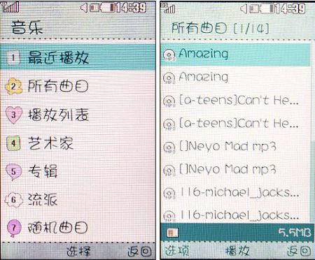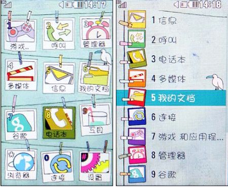 这款手机的界面非常Q,界面菜单可以显示为12宫格形式或者是列表形式,每一个功能的 图标设计都很卡通,而且选定以后图标都会动态显示。