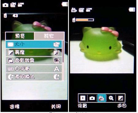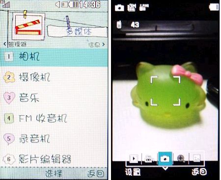 这款手机的拍照界面很简洁,拍照可以进行简单的设置。但是由于摄像头在手机按键的 后边,和屏幕有一定的角度偏差,这样会出现两个问题,第一是手容易遮挡住镜头,二是拍照时的 角度比较不好调整。