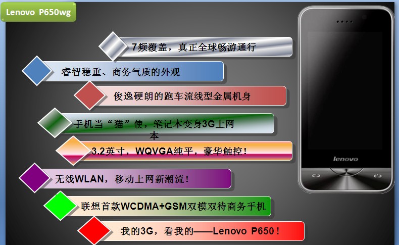 | 手机上网已经成为了商务人士最为热衷的新兴娱乐方式,3G的到来无疑是喜从天降的绝好消息,联想移动充分考虑3G一族的双模使用习惯与无线上网需求,首创WCDMA/GSM的双模无级变频与WIFI/WAPI全支持的四网合一理念,重磅推出P650wg手机,让您尽情体验3G生活,尽享无线移动互联乐趣。 联想P650wg采用全球覆盖率最广,速度最快的3G网络制式——WCDMA与2G主流GSM制式的双模双卡设计,可同时兼容GSM(850/900/1800/1900MHz)四个频段与WCDMA(850/1900/2100MHz)的三个频段,有效提高信号稳定性和区域兼容性,无论在世界任何地方都可以利用P650wg手机进行畅通无阻的上网和通话, 2G、3G网络轻松切换,让您充分感受到无级变频带来的便捷。 值得一提的是P650wg除了2G、3G网络之外,还支持WiFi和WAPI上网,实现了四网无缝合一,为各种模式下的高速上网提供了强力支持。无论是上班路上还是旅途之中都能轻松掌握第一手资讯,第一时间了解网络动态,享受3G的极致快感。 联想P650wg借助3G(WCDMA)与WLAN(WIFI+WAPI)无线局域网间的双通道, 可随时实现无缝高速互联。同时在操作体验上,该机追求更高的人性化标准,不仅集合了当前最具人气的新浪微博,同时预装了开心网、百度搜索、QQ、UCWEB浏览器等多种网络应用亦可通过沃勤平台轻松下载MSN等软件,涵盖商务、 生活、游戏、娱乐的丰富应用程序及海量网络游戏, 让工作、生活更加精彩和轻松。 P650wg除了本身具有上网功能之外,倘若在出差途中遇到没有网络接口的地方,联想P650wg即可化身“上网猫”, 通过USB接口直接与电脑连接,处理客户紧急邮件,上网查询资讯、收发邮件轻松自如,尽享移动办公的快乐。 联想P650wg拥有金属灵韵朗逸的外貌,精细的做工配以3.2英寸WQVGA超大高亮宽视角大屏幕,优雅中带有一份至尊霸气。P650wg其他功能也十分优异,该机配备300万象素效果摄像头与10万象素前置摄像头,让用户随时捕捉生活的感动时刻,与亲友“当面”分享。同时,P650wg还支持MP3、AAC、AAC+、MIDI、WMA、AMR等格式音频文件和3GP格式的视频文件,配合1GB的micro SD扩展卡,让您随心存储喜爱的影音文件。 在全民3G的时代,联想P650wg的迅猛登陆必将掀起高性价比的商务3G热潮,装备一款P650wg能够让您在畅享3G的同时又不失格调,别再犹豫,赶快体验3G带来的全新时代吧。 |