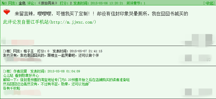 我想問沒有晉江會員,在台灣要怎麼才能訂購月下桑的 【管理员回复】 您好,您可以找懂电脑的朋友帮您注册一个晋江账号,然后就可以在晋江的囧囧商城购买《原始再来》了,如有不太明白请加商城客服QQ 1005038236咨询。谢谢您的支持~ |