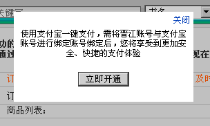 1、最近很多小伙伴们在支付时遇到了疑难情况:支付宝账号还没有与晋江账号绑定,暂时无法一键付款,这个时候点击“立即开通”就可以啦。