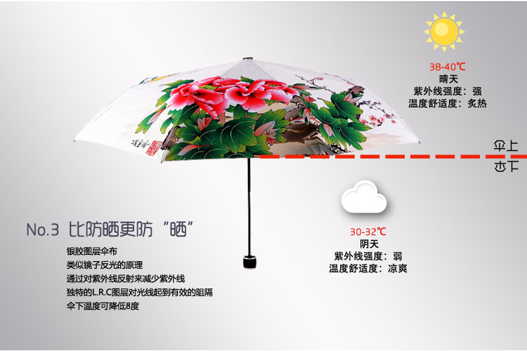 3、碰击银胶布伞面防晒又挡雨,是您日常出行的好伙伴。